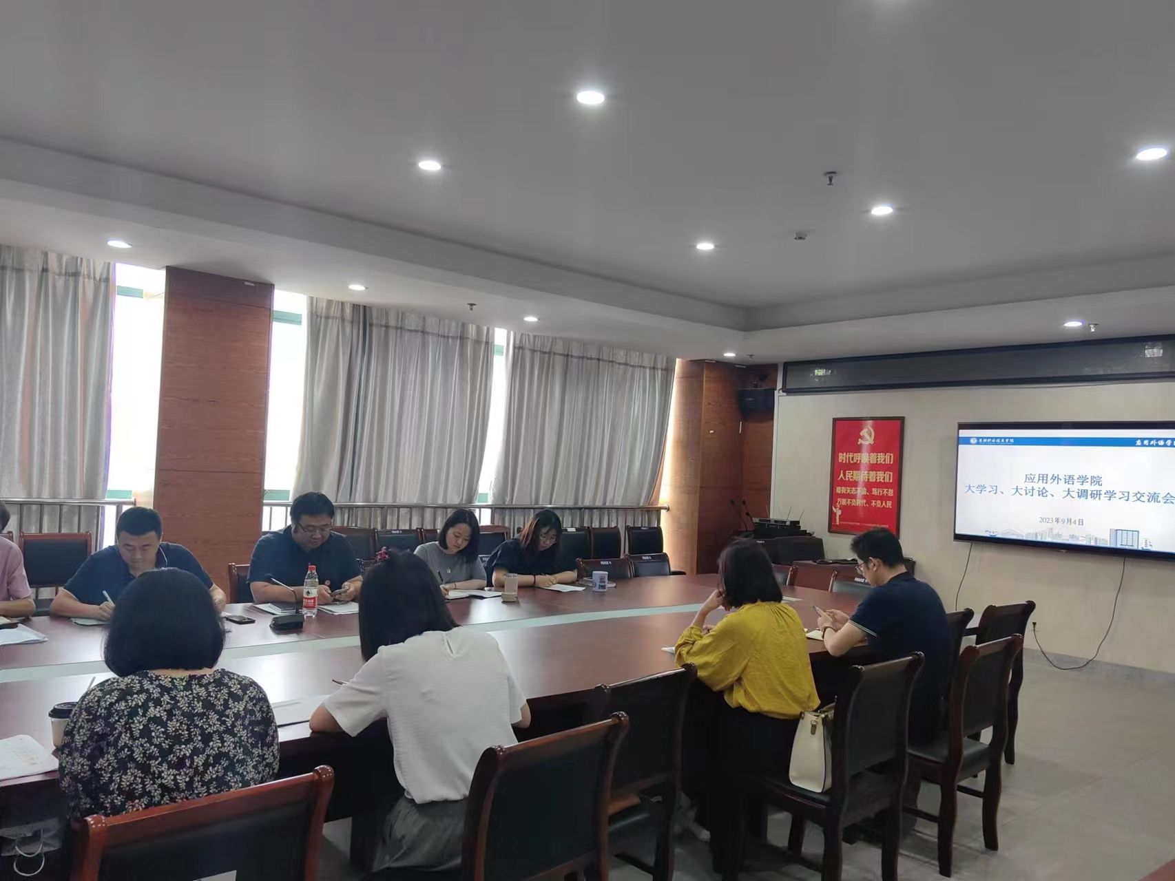 为贯彻落实省委、市委、学校“五个一”大学习大讨论大调研工作通知精神,9月4日下午,应用外语学院召开大学习、大讨论、大调研学习交流会议。会议由学院党总支书记朱力主持,学院党政班子成员及各教研室主任、专业带头人及部分高职称骨干教师参加。