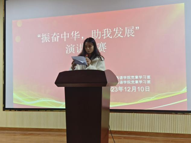 为进一步深入学习习近平新时代中国特色社会主义思想,坚定理想信念,12月10日, 应用外语学院党章学习班开展“振奋中华,助我发展”演讲比赛,全院大学生踊跃参与。活动由学院党章学习班班长葛瑶主持。