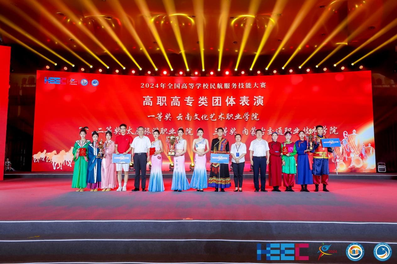 在24日晚的成果汇报展演上,中国高等教育学会会长、教育部原党组副书记、副部长杜玉波,全国人大常委会原副秘书长、全国人大法律委员会原副主任、教育部原党组成员李连宁,中国高等教育学会副会长、天津大学原党委书记李家俊等领导嘉宾上台为本次活动之第十四届全国高等学校民航服务技能大赛获奖团队颁奖。高武受邀为荣获高职高专组团体表演一等奖的云南文化艺术职业学院代表队颁奖。